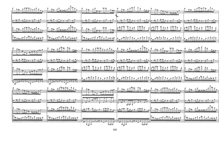 Extraits de la rédaction en cours de la partition (p. 49, 51, 102, 120) :